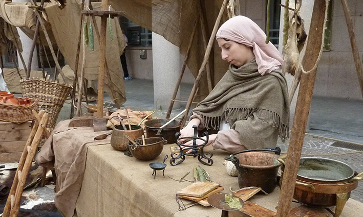 Le nostre bancarelle di Antichi Mestieri danno vita a un mercato colorato e coinvolgente, in cui i nostri figuranti interagiscono con il pubblico, spiegando nel dettaglio le attività tipiche di un mercato dell'Antica Roma.